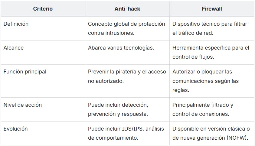 En resumen, el firewall es una herramienta, mientras que el anti-hack es una estrategia de protección más amplia que puede incluir varias tecnologías complementarias.